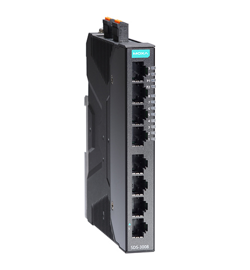 Commutateur Ethernet industriel intelligent 8 ports 10/100BaseT(X), IP40, protocoles EtherNet/IP, PROFINET et Modbus/TCP, interface web graphique, montage rail DIN ou rack, certifié IEC 62443-4-2 Level 1, températures -40 à 75 °C